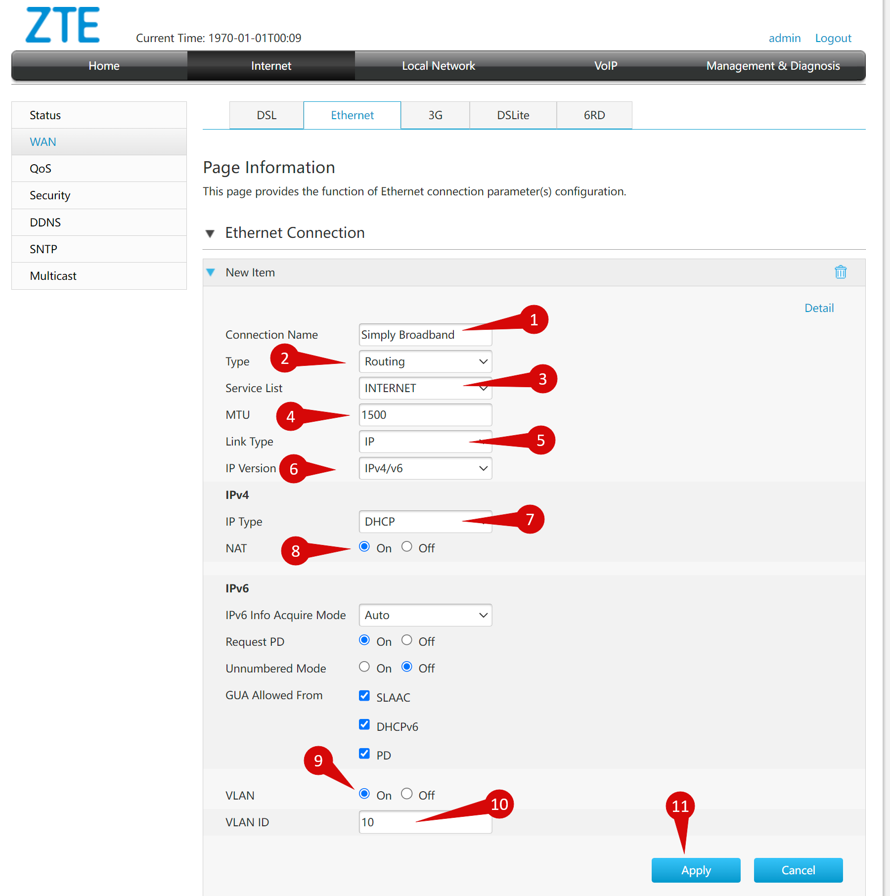 - After entering the VLAN and DHCP settings, click Save/Apply to save the configuration.