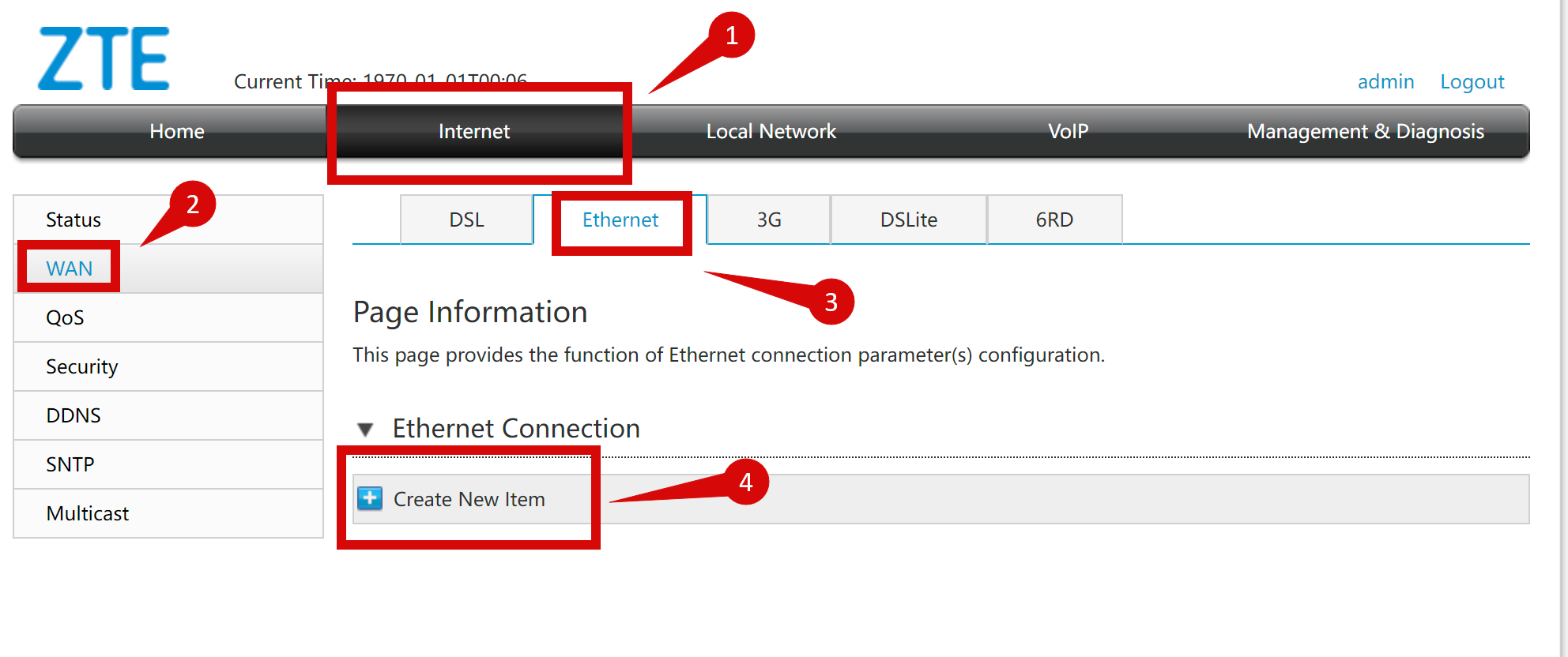 - Connect the WAN port of the ZTE H268A router to the first port (LAN1 or GE1) on your Optical Network Terminal (ONT) using an ethernet cable.